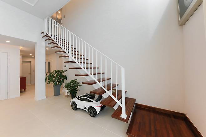계단실은 금속 오픈 계단 구조를 적용해 시원하고 개방감을 줌으로써 거실에서 포인트 역할을 하도로 했다. 흰색 난간과 멀바우 계단재가 미니멀한 공간에 이질감 없이 어울린다.