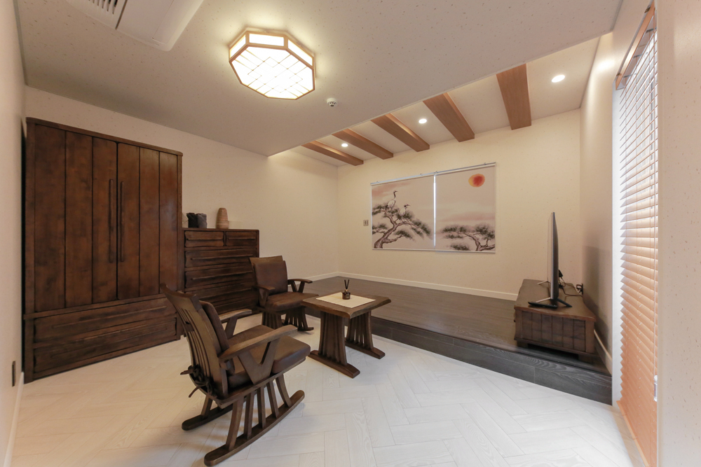 단 올림으로 툇마루와 영역을 분리한 부모님 방은 천장에 노출 서까래 디자인을 적용하고, 전통 무늬 조명과 도어를 설치해 한실 느낌을 강조했다. 짙은 우드 톤 가구를 배치해 차분하고 고풍스러운 분위기를 더했다.