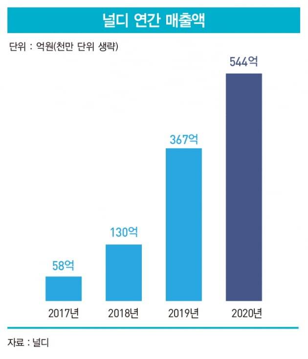 스트리트 브랜드 ‘널디’는 2017년 5월 브랜드 론칭 3개월 만에 매출 15억원, 지난해에는 연매출 544억원을 달성하며 놀라운 시작을 알렸다. 아이유·지코·빌리 아일리시 등 셀러브리티들이 착용해 관심을 모았고 연보라색 컬러와 오버핏으로 브랜드 이미지를 확고하게 다졌다. 최근에는 온라인에 이어 오프라인 매장 진입 1년 만에 30개로 매장을 확장하며 홍대 패션을 바꿔 놓고 있다.