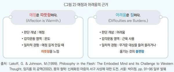 인간의 마음은 본유적으로 신체화되어 있다. 가구라는 추상적 개념을 생각할 때 떠오르는 것들이 무엇인가? 대부분 눈으로 보고, 손으로 만지고, 앉아본 것들, 즉 몸의 감각과 운동에 의해 체험된 주관적 경험들이 떠오를 것이다. 추상적 개념이라는 마음의 형식은 몸의 주관적 경험을 바탕으로 형성되어 있기 때문이다. 또한 ‘Sam is in the house’라는 문장을 떠올려 보자. 이 문장을 이해한다는 것은 집의 경계에 따른 샘의 위치를 안다는 것이다. 이러한 이해의 원천은 움직이며 안과 밖을 구분한 신체적 경험에 있다. <그림 2>에서 보듯이, 아주 추상적인 용어인 애정이나 어려움 역시 신체적 경험을 바탕으로 한다. 이런 점에서 인간의 마음을 구성하는 대부분의 것들은 신체적인 경험에 근거하며, 신체화되어 있다.
