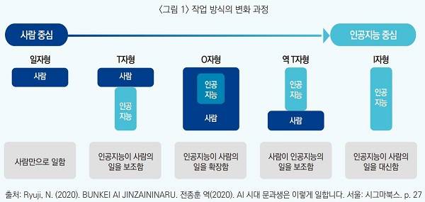 인공지능 기술의 발전은 작업 방식을 변화시키고 있다. 20세기 작업 방식은 일자형이나 T자형을 주를 이룬다(아래 그림 1 참조). 체육교육 현장을 예로 들자면, 디지털 기술들을 활용해 자료를 수집하고 분석하더라도 ‘수업’ 작업 방식의 중심은 언제나 체육교사였다. 그러나 인공지능 기술의 발전은 O자형을 넘어, 역 T자형으로 작업 방식을 변화시키고 있다. 인공지능 금융 프로그램 윌슨(Wilson)은 인간 증권맨의 업무를 대체하고 있으며, 알파고는 바둑 선생님이 되어 있다. 이전과 달라진 혹은 달라질 작업 방식의 특성은 작업의 중심에 인공지능이 있다는 것이다.