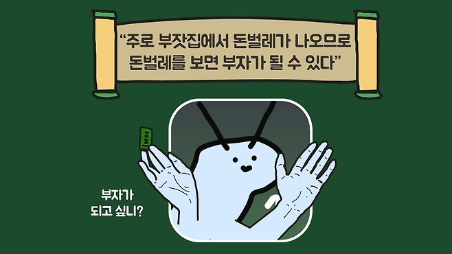 이와 관련해 두 가지 유래가 있습니다. 많이 알려진 유래는 주로 부잣집에서 돈벌레가 나오므로 돈벌레를 보면 부자가 될 수 있다는 건데, 여기에는 합리적인 근거가 있습니다.