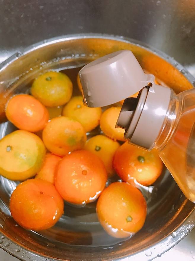 15분이 지나면 식초에 담갔던 귤을 흐르는 물에 뽀득뽀득하게 씻어주세요.