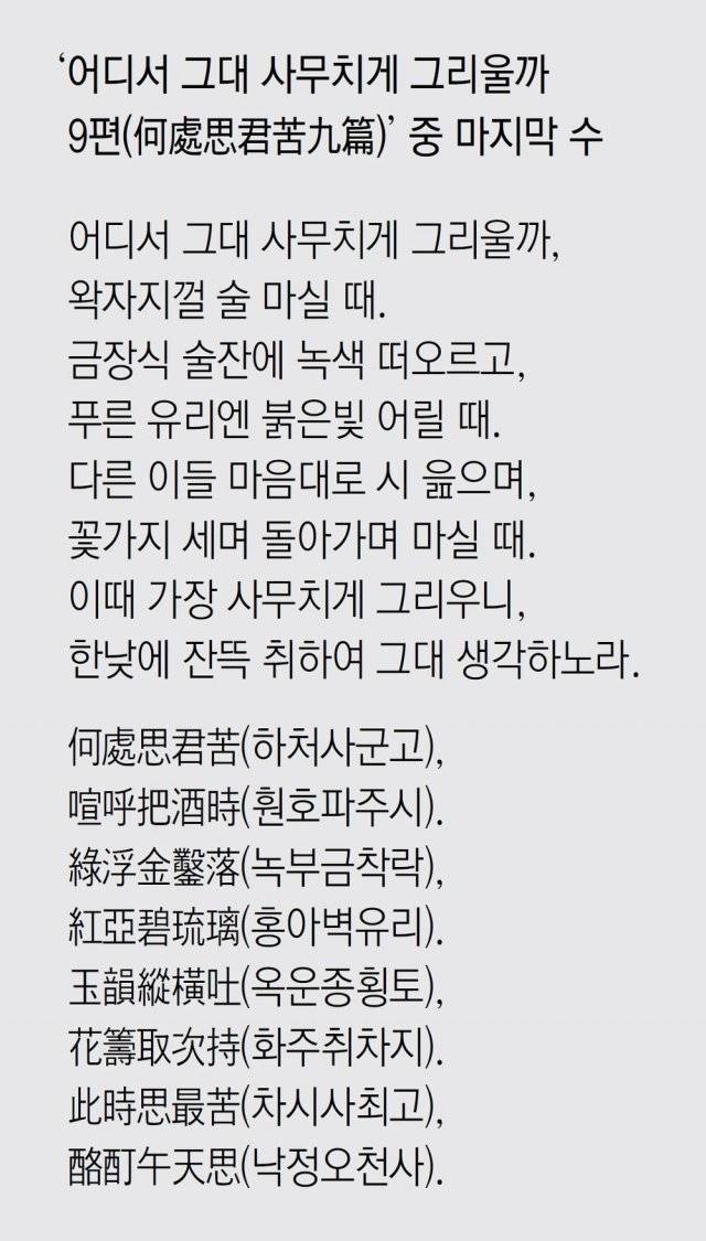 친구에 대한 그리움은 결코 그때만이 아니었다. 시인은 연작시에서 눈 내리는 겨울에도, 앵두꽃 피는 봄에도, 나비 날고 꾀꼬리 우는 여름에도, 기러기 떠나가는 가을에도 친구가 그립다고 토로했다. 어느 곳(‘何處’)에 있든 바로 이 순간(‘此時’) 친구가 너무나 보고 싶었다.