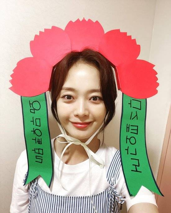 공개된 사진 속 전소민은 머리에 종이 꽃 장식을 달고 인간 화환으로 변신한 모습. 장식에는 '다시 태어나도 엄마 아빠 딸'이라는 문구가 적혀 미소를 자아낸다.
