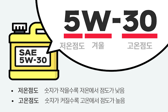 여러분은 엔진오일 통에 적혀있는 숫자의 의미를 알고 계시나요? 이는 바로 엔진오일의 점도를 나타내는데요. 숫자 사이에 있는 W는 Winter(겨울)를 나타내며, 그 앞의 숫자는 '저온 점도'를 나타냅니다. 그리고 뒤의 숫자는 '고온점도'를 나타내죠.