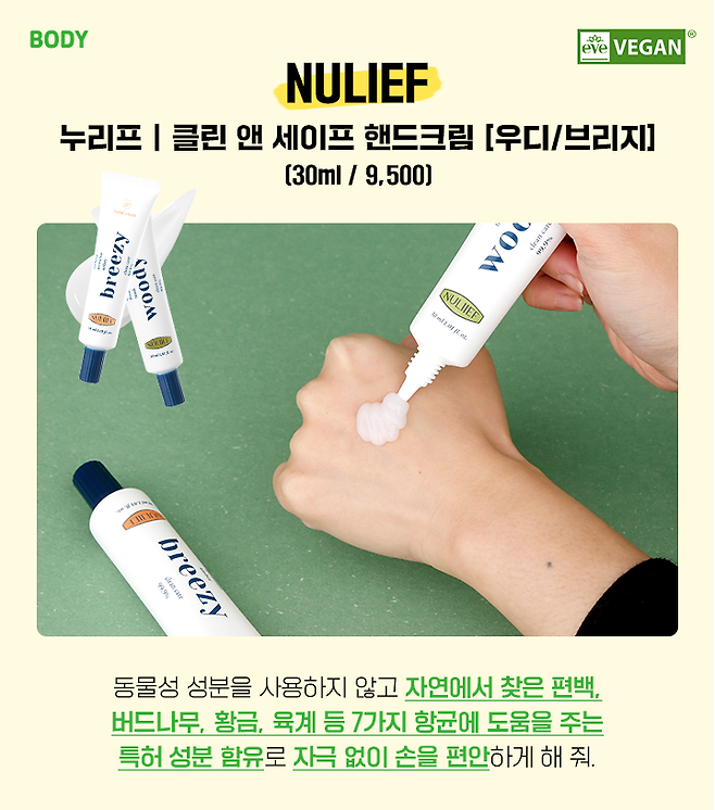 코시국 속 뗄레야 뗄 수 없는 손소독젤과 핸드크림. 누리프 클린 앤 세이프 핸드크림은 항균력 99.9% 손 세정은 물론 촉촉하고 건강한 보습까지 챙길 수 있는 제품인데 프랑스 이브 비건 인증까지 받은 비건 뷰티야. 우디, 브리지 총 2가지 향으로 우디는 은은한 숲속 향을 느낄 수 있고 브리지는 산뜻한 제라늄 꽃 향이 느껴져 취향껏 골라 사용하면 될 것 같아. 난 둘 다 좋더라고..♥︎