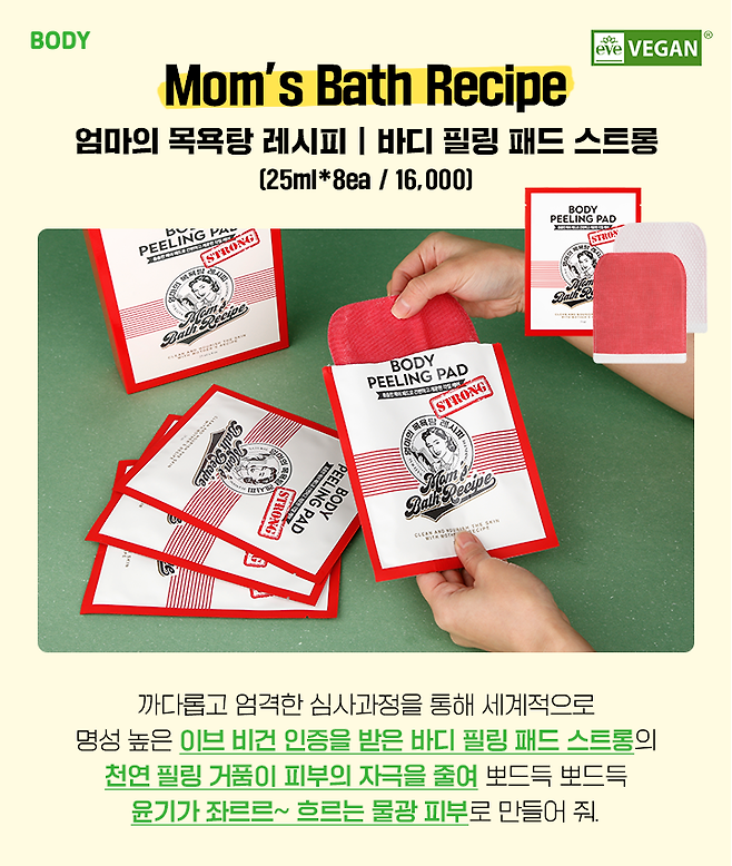 엄마의 목욕탕 레시피 바디 필링 패드 스트롱은 독특한 성분들 콘텐츠에서 소개했던 제품인데, 이브 비건 인증을 받은 제품이라 또 소개해. 바디 필링 패드 스트롱은 때밀이 한 것처럼 바디 각질을 시원하게 제거해 주는 제품인데, 각질 제거는 물론 피부 영양에 보습까지 한 번에 관리할 있어. 남녀노소 온 가족 모두 간편하게 사용 가능한 바디 필링 패드지.