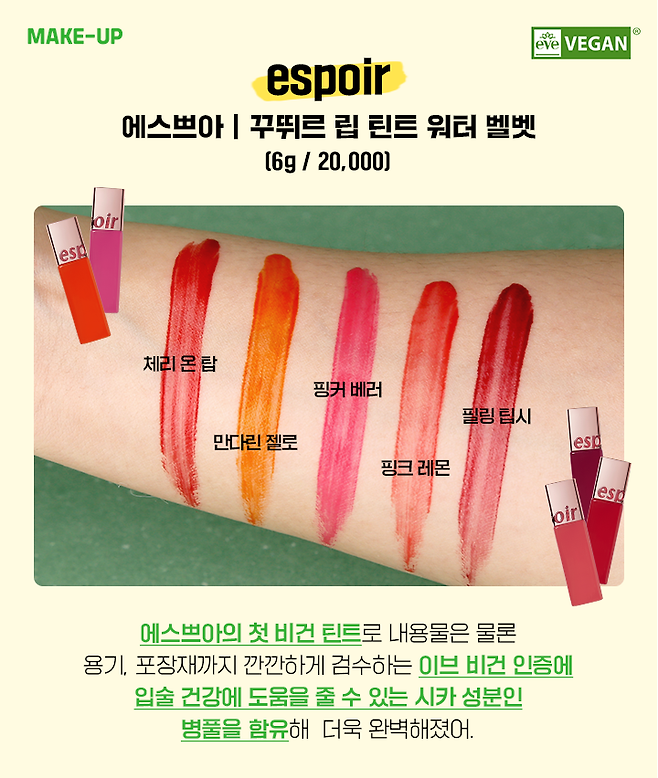 에스쁘아 꾸뛰르 립 틴트 워터 벨벳은 에스쁘아의 첫 비건 틴트로 내용물은 물론 용기와 포장재까지 깐깐하게 검수하는 EVE VEGAN 인증을 받은 제품이야. 게다가 시카 성분까지 함유해 입술 건강에도 도움을 줘. 총 5가지 컬러로 한 번의 터치로도 강력한 발색을 자랑하고 스며들 듯 강력하게 픽싱 되어 마스크에도 묻어나지 않고 오랜 시간 지속돼.