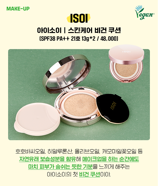 메이크업도 스킨케어처럼 피부가 편안하게 숨 쉬면 좋잖아. 아이소이 스킨케어 비건 쿠션은 동물 실험은 물론 동물성 원료를 배제한 비건 뷰티를 실천한 제품으로 아이소이만의 성분 노하우까지 더해 개발된 착한 쿠션이야. 무엇보다 호호바씨오일, 히알루론산, 올리브오일, 캐모마일꽃오일 등 자연유래 보습 성분까지 더해져 피부에 바르면 촉촉 건강하게 빛이 나.