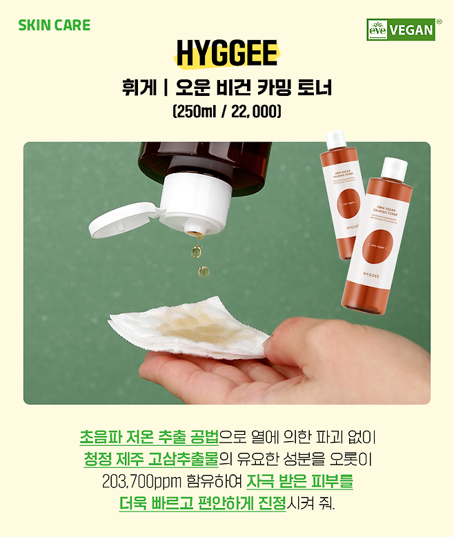휘게 오운 비건 카밍 토너는 프랑스 이브 비건 인증을 받은 수분 진정 비건 토너야. 초음파 오더 메이드 공법으로 추출한 청정 제주 고삼 추출물이 203,700ppm이나 함유되어 있어 자극받아 민감해진 피부를 빠르고 편안하게 진정시켜 줘.