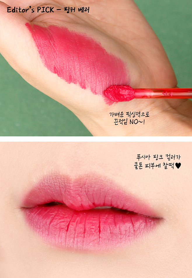 촉촉하게 발리지만 픽싱 되면 매끈하게 변하는 워터 투 벨벳 텍스처라 끈적이지 않고 오히려 편안한 느낌이 들어. 총 5가지 컬러 중 쿨톤 피부를 가진 에디터는 핑커 베러 컬러를 발색해 봤어. 쿨한 푸시아 핑크가 피부톤을 더욱 화사하게 해주더라. 보기만 해도 상큼 터지는 만다린 젤로부터 와인 바이올렛의 매력적인 딥 컬러 필링 팁시까지. 다양한 컬러 구성으로 내 피부에 맞게 선택해 사용하면 되는데, 맑디 맑은 체리 레드 컬러의 체리 온 탑은 카카오에서만 만나 볼 수 있다니 참고해!!
