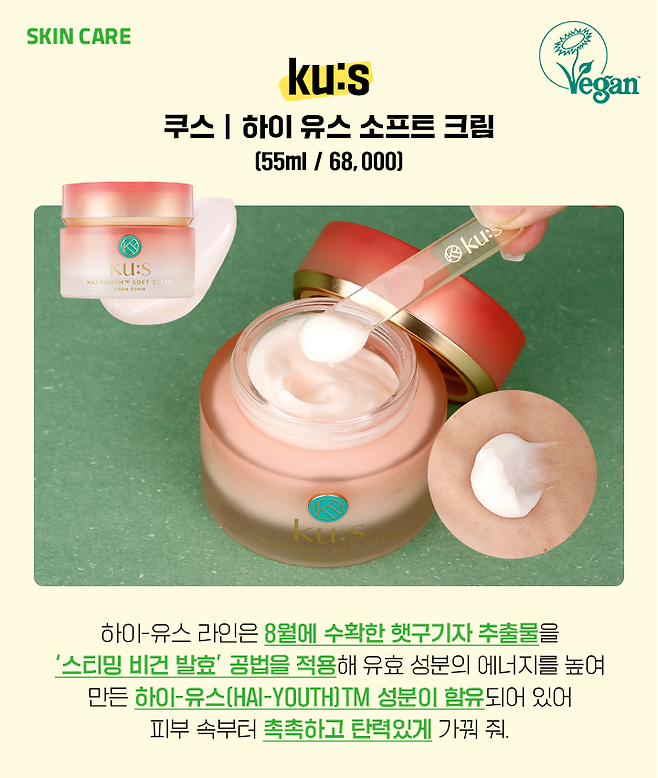 친환경 비건인증 브랜드인 쿠스에서 '하이-유스'라인이 새롭게 출시되어 나왔어. 하이-유스 라인은 세럼 에센스, 소프트 크림, 립 트리트먼트 마스크 총 3가지 제품으로 구성되어 있는데, 오늘 에디터가 추천해주고 싶은 비건 뷰티템으로는 비건 소사이어티 인증을 받은 보습 탄력 크림인 쿠스 '하이-유스 소프트 크림' 이야.