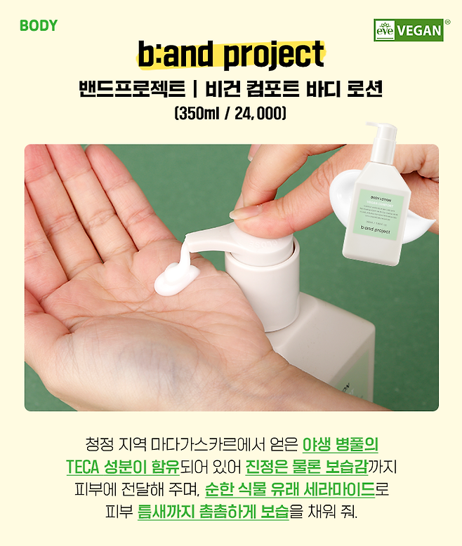 프랑스 이브 비건으로부터 비건 인증을 받은 밴드프로젝트 비건 컴포트 바디 로션. 청정 지역 마다가스카르에서 얻은 야생 병풀의 유효 성분 TECA가 함유되어 있어 민감해진 피부를 진정시켜 주고 식물 유래 세라마이드까지 함유되어 있어 피부 사이사이 촉촉한 보습을 촘촘하게 채워주는 제품이야. 피부 저자극 테스트는 물론 향료 알러젠 프리 성분분석 테스트까지 완료해 예민한 피부도 안심할 수 있어.
