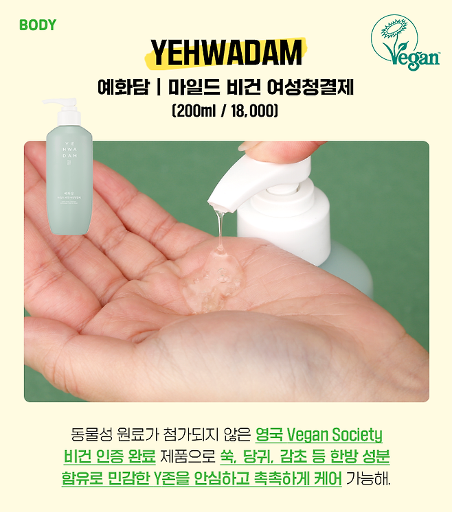 예화담 마일드 비건 여성청결제는 동물성 원료 무첨가에 영국 비건 소사이어티 인증을 받은 제품이야. 민감하고 예민한 Y존은 더욱더 순한 제품을 사용해 관리해 줘야 하는데, 예화담 비건 여성청결제는 약산성에 쑥, 당귀, 감초 등 한방 성분이 함유되어 있는 포뮬러라 Y존을 부드럽게 케어 가능해. 게다가 판테놀이 함유되어 있어 Y존을 촉촉하게 해 줘. 순한 여성청결제 찾고 있다면 예화담 마일드 비건 여성청결제 사용해 보길 바래!
