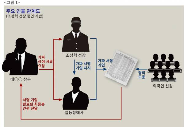 이때 미화 3만 달러를 ‘만들라’고 한 것은 비자금을 확보할 수 있는 가짜 비용 서류를 만들어달라는 의미였다. 배 상무가 지시한 가짜 서류는 외국인 선원의 명의를 활용한 ‘상여 지급 내역’이었다. 조 선장은 선내 항해사에게 지시해 선원들의 특별 상여금 서류를 만들고 여기에 가짜 서명을 기입하는 방식으로 서류를 꾸몄다.