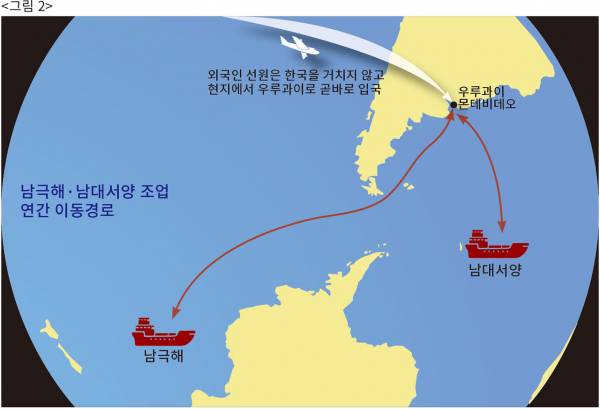 조 선장이 이끌던 S호 역시 외국인 선원을 우루과이 몬테비데오에서 승선시켰다. 선원들이 인도네시아와 중국, 베트남 등지에서 지구 반대편인 우루과이까지 날아와 배에 타는 것이다. S호는 조업 특성상 정산과 하역, 승선과 하선 모두 우루과이 현지에서 이뤄지고 주요 사무 역시 이곳에 위치한 지사(A실업과 형제기업인 B실업의 현지 지사)에서 처리된다. 한국의 행정력이 이들의 자금 내역이나 급여 정산 등을 일일이 감시하기 어렵다.