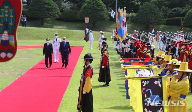 [서울=뉴시스] 전진환 기자 = 토카예프 카자흐스탄 대통령이 문재인 대통령과 17일 청와대에서 공식환영식에서 전통의장대를 사열하고 있다. 2021.08.17. amin2@newsis.com