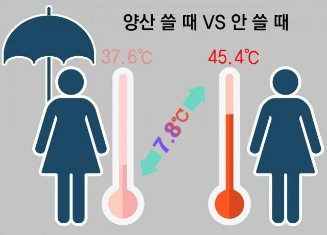 22일 오후 1시 서울 종로구 세종대로 사거리에서 검은 색 양산을 들었다. 이 때 종로구의 온도는 35.0도. 양산을 썼을 때 기자의 머리 표면 온도는 37.6도였다. 양산을 내리니 뙤약볕이 머리를 달구면서 머리 끝부분의 표면 온도는 5분 만에 45.4도까지 올라갔다. 양산 사용 여부가 약 8도 가량 차이를 만들었다. 일반적으로 양산을 쓰면 체감 온도는 7~10도 가량 낮출 수 있는 것으로 알려져 있다.