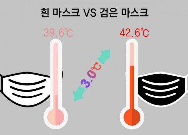 색깔로 인한 온도 차이는 신종 코로나바이러스 감염증(코로나19) 예방을 위해 꼭 써야 하는 마스크도 예외가 아니었다. 마스크 표면 온도는 숨을 마실 때보다 내쉴 때 1~2도 가량 올라갔다.