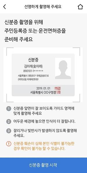 인터넷 뱅킹에서 자주 접해봤던 주민등록증, 휴대폰, 계좌 인증을 진행합니다.