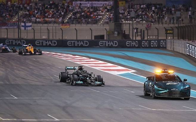 반전의 불씨는 니콜라 라티피(윌리엄스)가 일으켰다. 14번 코너에서 스핀 후 벽에 충돌, 사고 수습을 위해 세이프티카가 나섰다. 종료까지 겨우 5바퀴 남았기 때문에, 이대로 경기가 끝나 해밀턴이 우승할 가능성도 있었다. 여기서 FIA가 파격적인 결정을 내렸다. 해밀턴과 베르스타펜 사이 백마커들을 모두 세이프티카 앞으로 보내 각자의 순위로 돌아가도록 지시했다. 자연스레 두 라이벌이 다시 만났고, 마지막 라운드 마지막 랩에서 챔피언을 가리게 됐다.