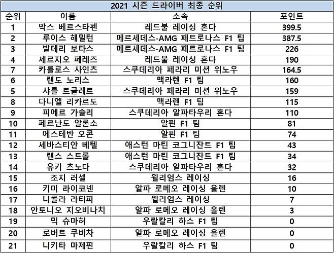 이렇게 메르세데스-AMG VS 레드불이 뜨겁게 싸웠던 2021 F1 시즌이 끝났다. 메르세데스-AMG 팬들은 슬퍼하겠지만, 한 팀의 독주가 지겨웠던 사람들은 그 어느 때보다도 즐겁게 바라봤을 듯하다. 페라리와 맥라렌, 알핀과 알파 타우리 등 주목할 만한 대결 구도도 많았으니까. 과연 새 규정, 새 드라이버와 함께 돌아올 2022년에는 어떤 팀이 우승할까?