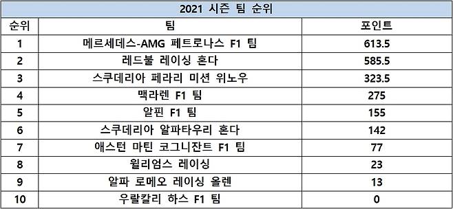 비록 해밀턴은 5년 연속 챔피언을 달성하지 못했지만, 페레즈의 막판 리타이어로 메르세데스-AMG는 ‘8년 연속 컨스트럭터 챔피언’이라는 역사적 기록을 세웠다. 2014년, V6 1.6L 가솔린 터보 하이브리드로 파워트레인 규정을 바꾼 뒤 단 한 순간도 정상에서 내려오지 않았다. 내년에는 레이스카 디자인과 휠 크기, 공기역학 설계 등 많은 부분에서 변화를 겪을 예정. 메르세데스-AMG가 지금의 퍼포먼스를 유지할 수 있을지 지켜볼 만하다.