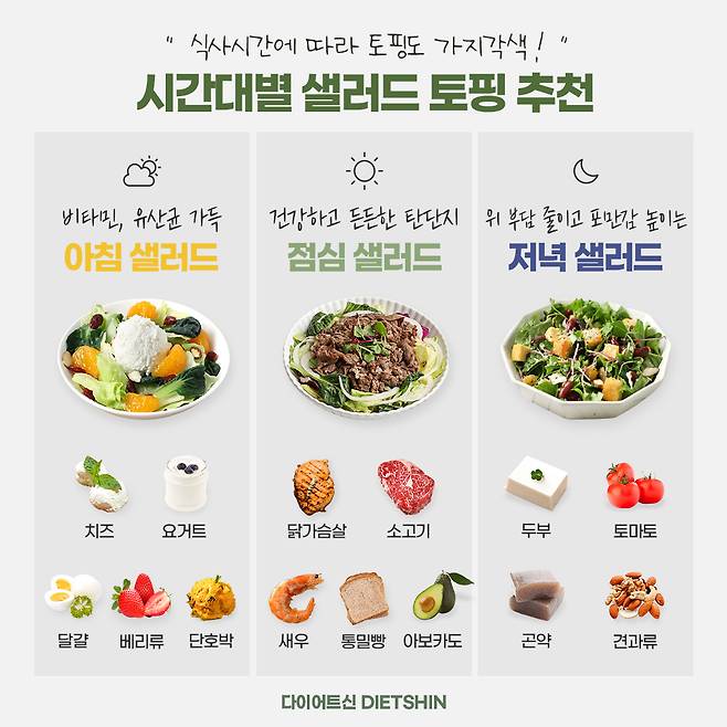 그럼 지금부터는 아침, 점심, 저녁 샐러드에 어떤 토핑이 어울릴지 간단하게 알려드릴게요.