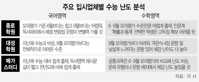 지난 6월(1등급 비율 5.51%), 9월(1등급 비율 4.87%) 모의평가와 마찬가지로 수험생들의 시간 관리가 중요한 변수로 작용했을 것으로 전망했다.