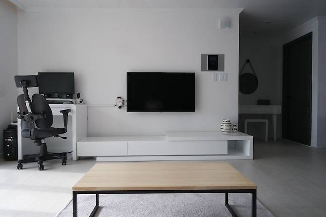 컴퓨터 책상과 거실장은 각기 다른 브랜드의 제품들이지만, 같은 하이그로시 재질의 가구로써 통일성을 주고자 하였습니다.