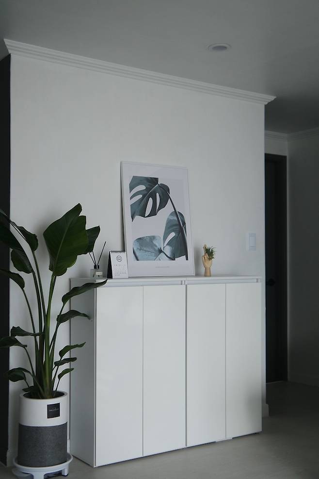 식물들을 좋아해서 저희 집에도 플랜테리어를 접목했습니다. 나름의 미니멀이 컨셉이었기에 소품은 최소화 했습니다. 전체적으로 볼 때 다용도장 위의 공간에 소품들이 가장 많이 올려져 있습니다.