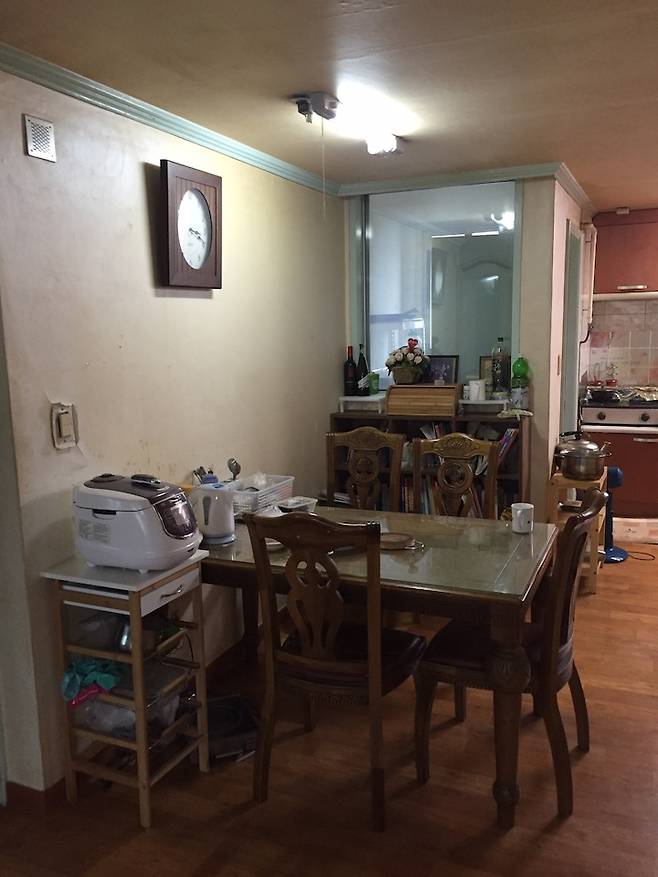 먼저 보여 드릴 모습은 거실 BEFORE입니다. 20년 이상의 오래 된 집이기에 체리색과 형광색의 몰딩, 체리색 장판, 오래되어 찌든 벽지, 그리고 모든 물건을 꺼내놓고 생활하시는 부모님의 생활패턴이 잘 표현된 사진입니다.