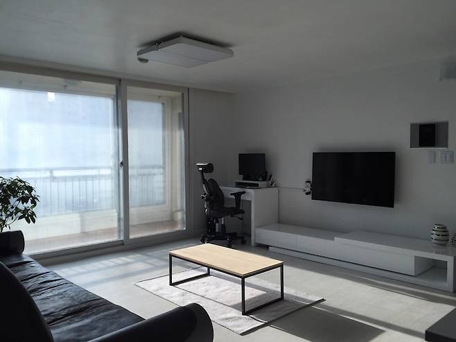 소파테이블은 원래 흰색 상판의 블랙 철제 프레임의 제품 (바이헤이데이 멀티큐브) 으로 진행하고자 하였지만, 부모님의 의견을 반영하여 원목 제품으로 구매하였습니다. 처음에는 통일된 색상이 아니었기에 마음에 들지 않았지만, 흰색 바탕의 심심한 분위기에 포인트가 된 것 같아 지금은 만족하고 있습니다.