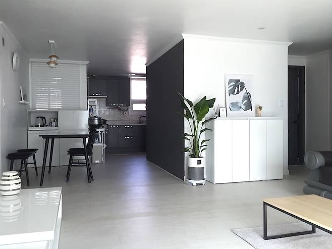 같은 구도의 AFTER 입니다. 모두 페인팅 작업을 했고 거실 및 다이닝룸 반대편 벽면에는 화이트 인테리어의 심심함을 달래고자 차콜색상으로 포인트를 줬습니다.