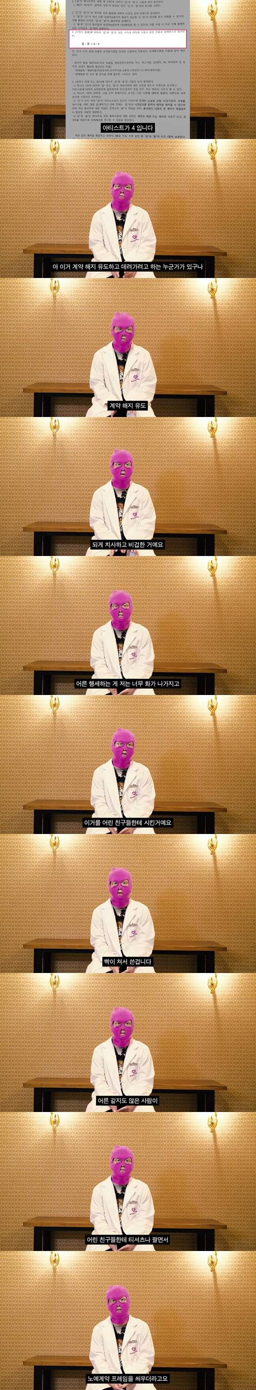 이어 그는 "그럼 이제 최근 데이토나에서 데려간 두 아티스트, 바로 직전 저희 소속이었던 친구들의 경우를 보겠다. 이 친구들은 A와 B라고 하겠다. 이름 거론되는 걸 최대한 피하기 위해서니까 이해해달라. A는 저희 소속 아티스트, 다른 한 명인 B는 제가 속한 회사의 대표님이 운영하시는 회사 소속이다. 이 대표님은 뷰티풀 노이즈의 대표로도 업무를 해오셨기 때문에 사실상 한 회사라고 봐도 된다. A의 계약은 뷰티풀 노이즈 이름으로 이루어졌고, 속한 곳은 뷰티풀 노이즈의 서브 레이블로서 제가 계획하고 있던 곳이다. 따라서 계약 요율은 다르다. 이곳에 속한 친구들은 회사가 6, 아티스트가 4이다. 뷰티풀 노이즈 정식 멤버들과는 요율이 좀 다르다. 왜 다르냐면 이 친구들이 계약할 당시엔 다들 중학생이었다. 인지도 자체라는 게 없었고 음악을 만들어내는 퀄리티도 많이 손을 봐줘야 되는 상태였다. 비율이 회사가 더 높다고 돈을 벌고 그런 상황도 아니었다. 향후 몇 년간은 최소 기대를 못하는 상황이었다 그래서 사실 요율 자체도 회사 입장에선 별 의미가 없다"라고 말했다.