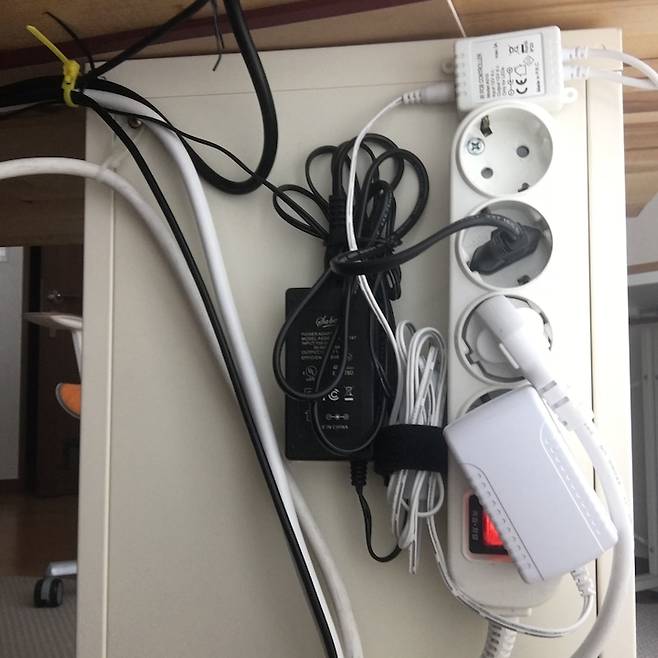 어댑터들은 앙면폼테이프를 이용해 서랍장에 고정해줬어요. 안정된 지지를 위해 멀티탭 위쪽 공간도 활용해줍니다.