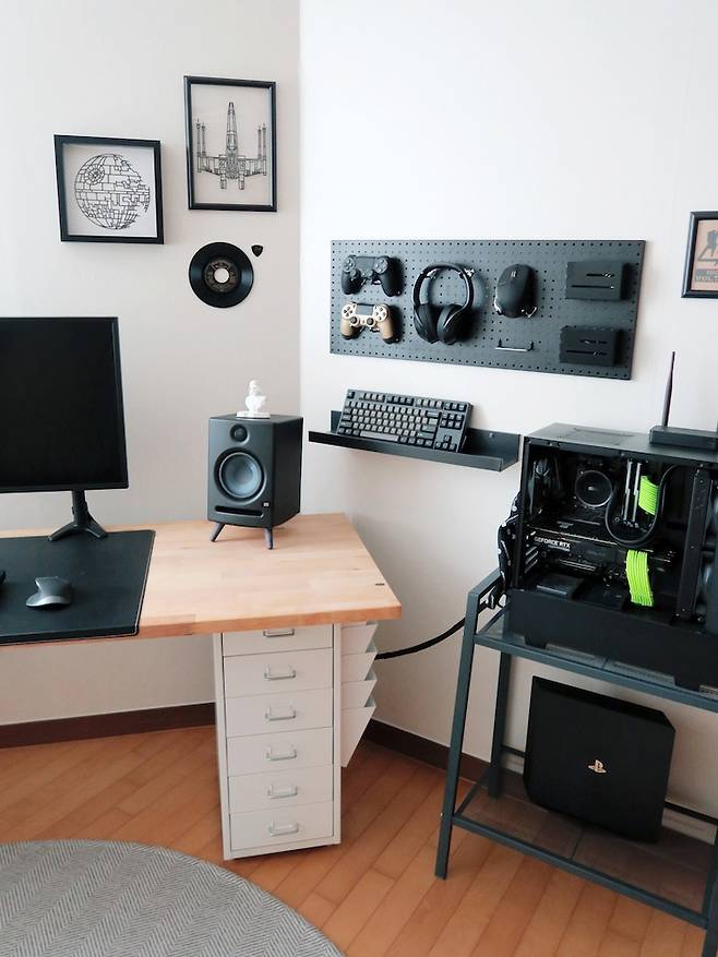 새로 옮기게 된 책상은 따로 다리 없이 철제서랍장으로 지지하게 되어, 이것들을 선 정리에 적극 활용해봤어요.