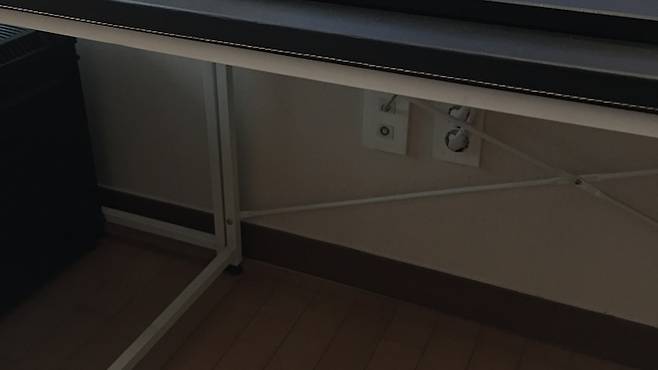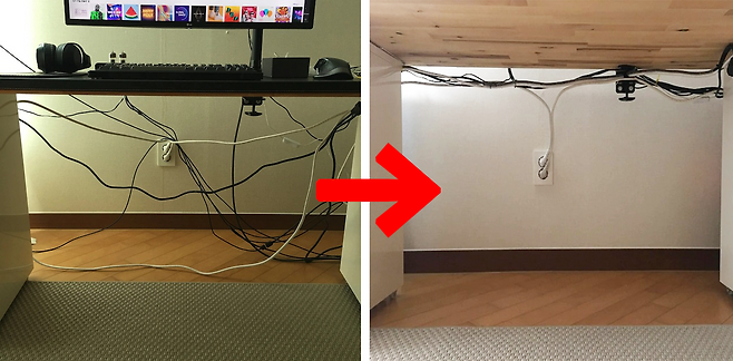 그리고 주렁주렁 늘어져 있는 선들을 숨겨줄 건데요. 이 책상은 좁은 공간에 놓여있어서 선이 벽면에 있는 콘센트 밑으로만 내려오지 않게 하면 돼요.