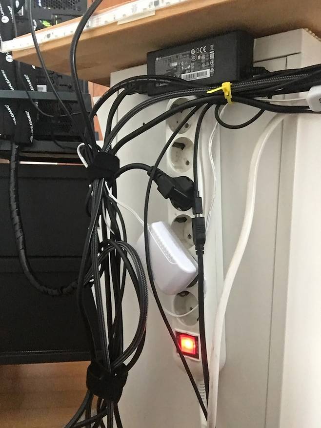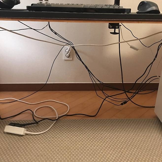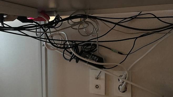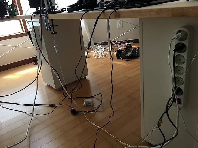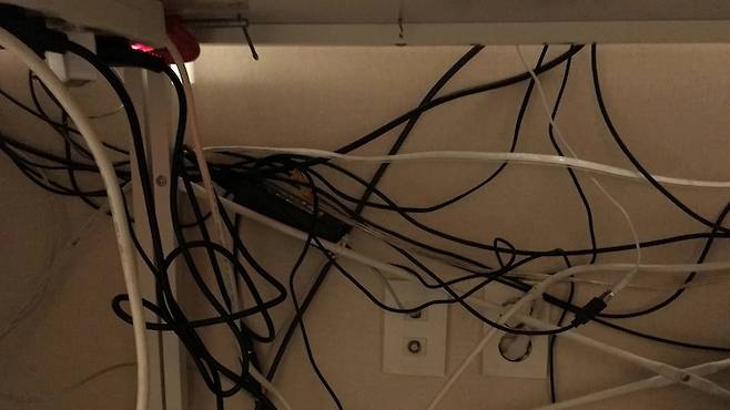 전자기기들 연결 후, 치렁치렁 늘어진 선들.
