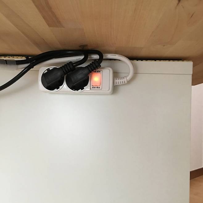 우선 멀티탭을 책상 상판 아래에 나사로 고정합니다.