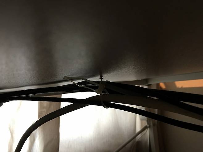 아무것도 없을 때는 책상 상판 아래에 후크형 고리를 박아서, 보기 싫게 늘어지는 선들을 고정할 수 있답니다.