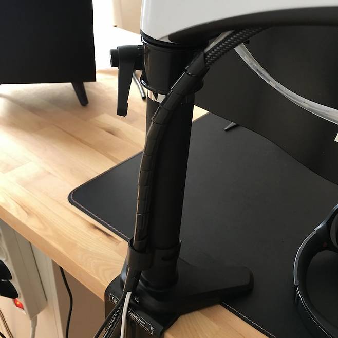 모니터 쪽부터 정리해줍니다. 잘 보이는 부분은 아니지만 헤리컬밴드로 묶어주면 한결 정리가 편해요.