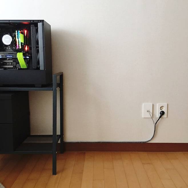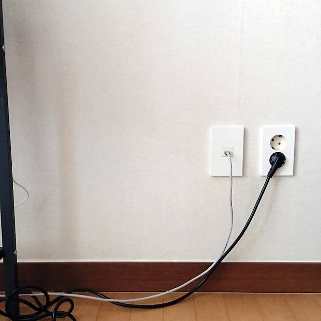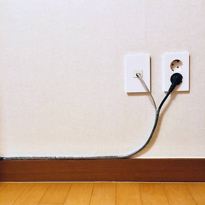 벽체에서 나오는 전원 선과 랜선은 어떻게 해도 숨기기가 어렵죠.