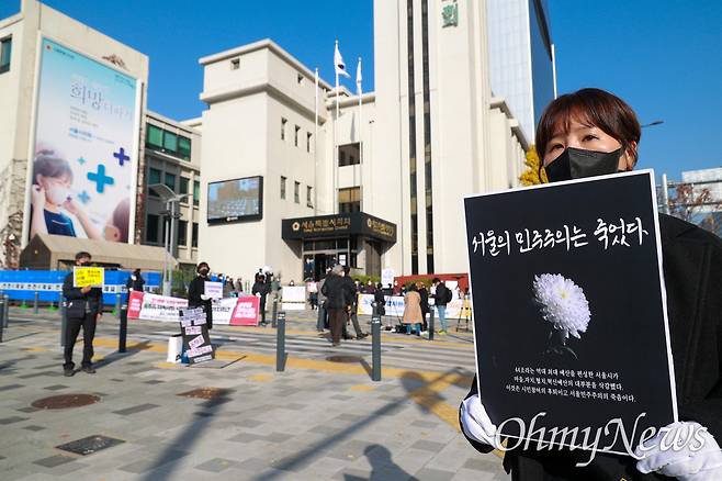 "44조라는 역대 최대 예산을 편성한 서울시가 마을, 자치, 협치, 혁신예산 대부분을 삭감했다. 이것은 시민참여의 후퇴이고 서울민주주의의 죽음이다." 오세훈 시장이 참석한 서울시의회 본회의가 열린 16일 오전 서울 중구 서울시의회 앞에서 한 시민단체 관계자가 피켓을 들고 침묵시위를 벌이고 있다.