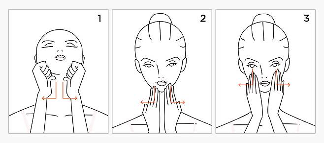 2 네 손가락을 턱 밑에서 턱 끝으로 당긴다. 그리고 턱선을 따라 귀 방향으로 마사지한다.