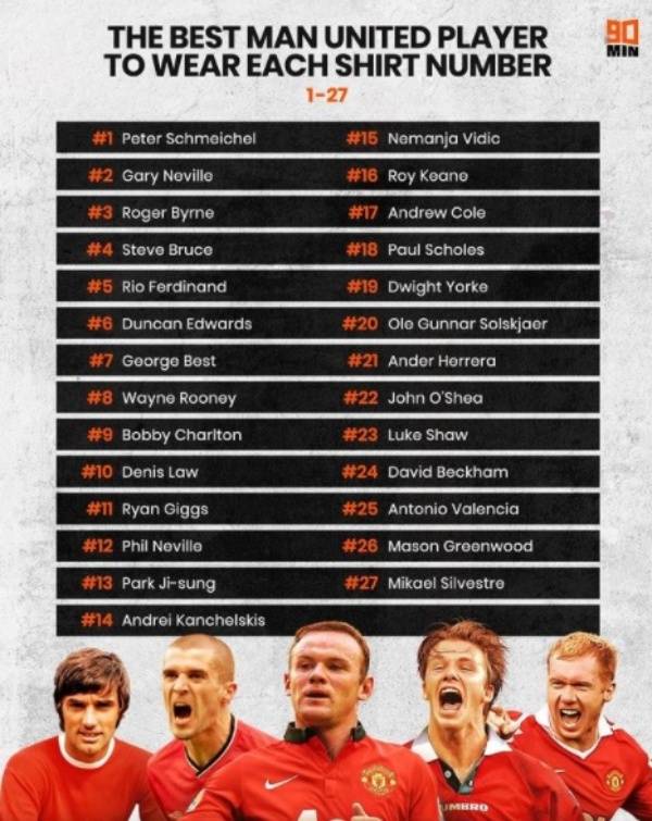 영국 매체 '90min'은 10일(현지시간) 등번호 1번부터 27번까지 각각 역대 최고의 선수를 뽑아 소개했다.