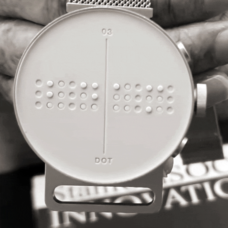 4cm 남짓한 작고 동그란 판 위에서 24개의 점들이 오르락내리락거린다. 점자를 아는 사람이라면 이는 시간이 1초씩 흐르는 모습을 점자로 나타낸 것이라는 것을 금방 눈치챘을 것이다. 다소 생소한 디자인이지만 이 제품은 소셜벤처 '닷(DOT)'에서 세계 최초로 개발한 촉각/점자 스마트워치인 '닷 워치'이다. 총 4개 셀(6개 핀)으로 구성된 디스플레이를 통해 시간은 물론이고 스마트폰과 연동하면 문자메시지, 메모, 전화 기록도 알 수 있다. 닷 워치는 스티비 원더, 안드레아 보첼리도 출시 전 선주문한 것으로 이름을 알렸다.