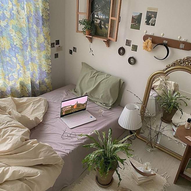 [제품정보] 거울 : 브릭나인 프렌치 벽거울 / 벽행거 : 오룸 빈티지 우드 코트랙 / 협탁 : 오딕 TAN 탄 라운드 멀티 매거진랙 / 베개커버 : 몽생드랑 상스 민무늬 베개커버 / 벽선반 : @bbambiing Window Frame Shelf / 러그 : 마인드비 모로칸 태슬 러그, villa501 textured cotton rug / 매트리스커버 : 몽생드랑 60수 라일락 고밀도 바이오워싱 매트리스커버 / 커튼 : 띠끄룸 퍼플 핑크 꽃 엔틱 커튼, 초이지엔느 롤리팝 캔디 체크 면커튼