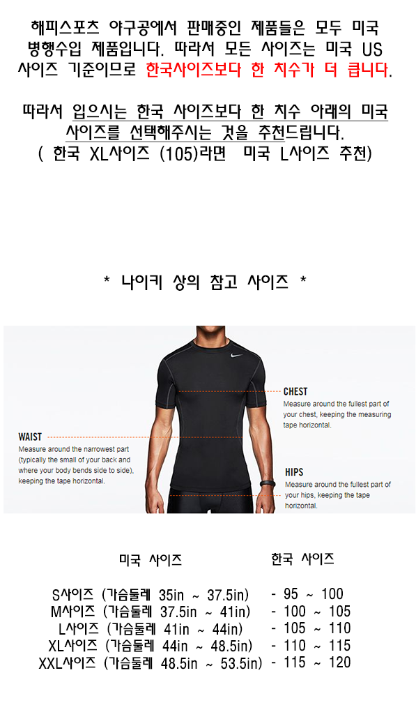 야구공에서 파는 제품들은 모두 미국제품입니다 때문에 한국보다 한 치수가 더 큽니다. 한국사이즈 처럼 주문하시면 사이즈가 크니 꼭 하단의 사이즈표 참고하셔서 주문해주시기 바랍니다!